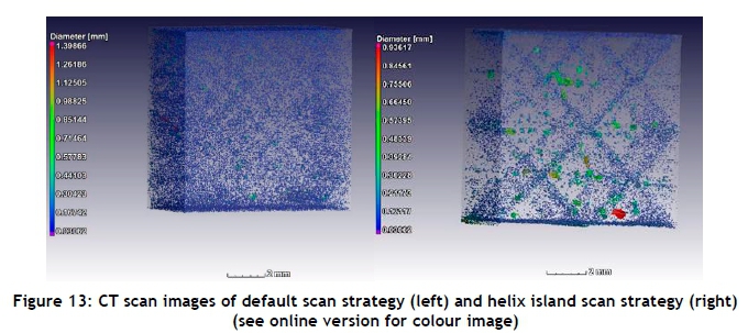One can note from the default scan strategy sample that the pores were found to be in an island pattern, with a 1mm shift in the x and y direction for each layer. This could have been caused by sub-optimal laser parameters being used, or by the laser not switching off when shifting to a different scan track. This causes a sharp turn where gas or powder can be trapped. With the helix scan strategy, an X shape is apparent. This is due to the laser parameters not being adjusted for the helix strategy. The pores occur on the corners of the squares in the helix pattern. The laser does not tend to follow the vectors completely, and forms a radius when moving from one vector to a perpendicular one. Both of these problems could be solved with laser parameter optimisation.
