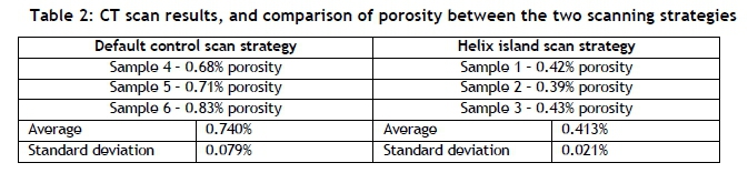 Reduction in deviation could be attributed to the relief of residual stress from porosity in the part or from the scan strategy. A porosity evaluation is therefore fundamental to determining whether porosity was the main contributing factor to the reduction in deviation. The porosities from the CT scans can be observed in Table 2.