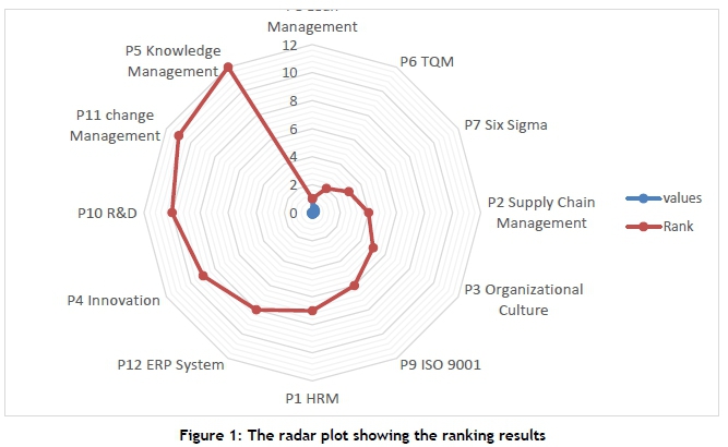 The calculations of TOPSIS showed that the practices with the maximum Ci values are the major contributors to the OP of manufacturing organisations. As shown in Figure 1, a summary of the ranking of all practices in the form of a radar plot produces P8-P6-P7-P2-P3-P9-P1-P12-P4-P10-P11-P5, in decreasing order of preference. Practices with larger index values are significant contributors of OP. LM practices are the most influential, with the highest Ci value of 0.9941. It is also evident from Table 9 that LM practices have the shortest distance (0.0017) from the positive ideal solution (PIS), and the furthest distance (0.2813) from the negative ideal solution (NIS).