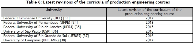 Although the curricula of the production engineering courses of some of the analysed universities underwent revision in 2017, it is not clear that this revision has taken into account the skills and competencies required by Industry 4.0.
