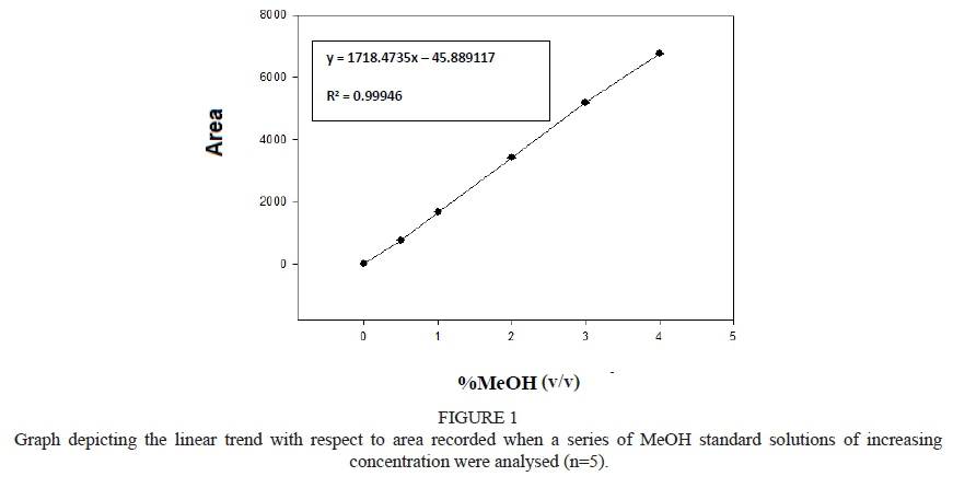 An acceptable linearity was demonstrated between the specific MeOH and EtOH peak areas and concentrations of the injected standards over a range of concentrations, between 0.5 - 4% (v/v) for MeOH and 5 - 25% (v/v) for EtOH, respectively (Table 5). The correlation coefficient (R2) = 0.99946 and regression coefficient (R) for MeOH was 0.99934 (Fig. 1) and the EtOH correlation coefficient (R2) = 0.99972 and regression coefficient (R) was 0.99967 the (Fig. 2). This clearly indicated that the linearity was satisfactory for MeOH and EtOH. The LOD for MeOH was 0.00000142 μg/mL and the LOQ was 0.00000473 μg/mL (Table 5). The LOD for EtOH was 0.000603 μg/mL and the LOQ was 0.00201 μg/mL (Table 5).