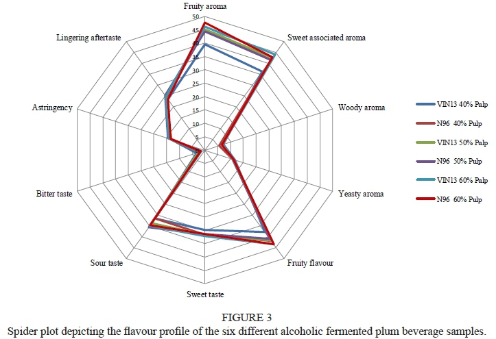 Principal component analysis (PCA) was performed to summarise the sensory data. When reviewing the PCA results, the correlation was not strong enough between dependent variables (DV), namely fruity aroma, sweet-associated aroma, woody aroma, yeasty aroma, sweet taste, sour taste, bitter taste, lingering aftertaste and fruity flavour. This means that the information inherent in each DV was unique, as it did not influence the response to any other. The Kaiser-Meyer-Olkin Measure of Sampling Adequacy (KMO) test result was 0.695, with the ideal value > 0.8, but since it was significant (p < 0.001), the components with Eigen values > 1.00 were extracted. The extraction yielded three components, with component 1 explaining only 26.53% of the total cumulative variance, component 2 only 43.70% and component 3 only 59.99% of the total cumulative variance. Hence, the three components explained less than 60% of the total cumulative variance, while the ideal is > 80%. Moreover, this means that 40% of the information contained in the data would be lost when using this data reduction tool. Hence, PCA was not a suitable tool to explain variability in the judgement of the trained panellists concerning the response variables. Instead, a spider plot was used to summarise the data (Fig. 3). The lines on the spider plot, describing the individual curves corresponding to the different treatments, are virtually superimposed (Fig. 3). This signifies that the treatments had a minimal effect on the sensory characteristics, resulting in panel responses that showed that he panel did not find considerable differences between the samples. Overall, woody aroma ranged between 4.62 - 8.72 and yeasty aroma ranged between 8.57 - 14.20 (Table 8). Hence, both aroma attributes were scored at the lower end of the line scale (Figure 3). The mean scores for lingering aftertaste ranged between 20.50 - 26.70, i.e. although double the highest score for yeasty aroma, it was still closer to "Absent" on the line scale. Fruity aroma and sweet associated aroma were rated significantly higher as the pulp concentration increased from 40% to 50% (p < 0.05), but was not rated significantly different (p > 0.05) as the pulp concentration increased from 50% to 60%. However, the scores for fruity flavour at 60% pulp concentration were significantly different (p < 0.05) for all three sessions, with this pulp concentration resulting in the most intense fruity flavour. The result (Table 8) agrees with that observed on the spider plot (Figure 4) where overall 60% pulp concentration resulted in the highest fruity flavour. The differences in sweet taste between samples were not significant (p > 0.05). Hence, the different treatments did not affect the panel's response in terms of sweet taste. This agrees with the sugar levels that were measured in °Brix which were all very similar and not significantly different (p > 0.05) (Table 7). Sour taste was rated significantly lower (p < 0.05) for 40% pulp concentration, than for 50% and 60%, while the panel rated the sour taste most intense in most of the samples containing 50% pulp (Table 8). As far as TA is concerned, these results partially agreed with the results in Table 7, with the lowest TA recorded for 40% pulp. However, contrary to the sensory results for sour taste, the highest TA was measured for 60% and not for 50% pulp (Table 7), while the pH at all pulp concentrations were similar (Table 7). The panel's overall response for sourness ranged between 31.00 - 45.75, i.e. approximately midway between "Absent" and "Intense". This anomaly could be explained by the fact that fruitiness was most intense at 60% pulp concentration thereby making the higher level of sourness more acceptable to the panel. Bitter taste was rated significantly different (p < 0.05) for 40% pulp concentration samples. However, the results showed inconsistency in the sense that no clear trend was identifiable, since in some cases the bitterness in 50% pulp concentration samples were rated most prominent, while in other cases the 40% pulp concentration samples were rated most bitter. This could be attributed to the fact that phenols present in plum alcoholic fermented beverage samples can cause both a bitter and astringent sensation, which are easily confused by panellists (Noble, 1999). Therefore, the influence of astringency in samples could have confounded the panel's response to bitterness (Noble, 1999). Further credence is lent to this hypothesis, since astringency was also not rated significantly different (p > 0.05) (Table 8). Hence, the processing parameters used in this study produced alcoholic fermented plum beverages that exhibited comparable sensory attributes namely fruity aroma, sweet-associated aroma, yeasty aroma, sweet taste, sour taste, bitter taste, astringency and fruity flavour , that were typically associated with white wines (Sokolowsky et al., 2015).