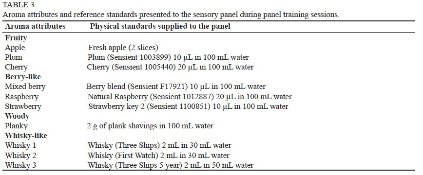 During the first part of the training, panellists were exposed to a number of reference standard samples (Table 3) to familiarise themselves with the product and the analysis protocol. Thereafter, panellists were given alcoholic fermented plum beverage samples, where the panellists were then instructed to compare the aroma attributes of the reference standards to the aroma of the samples. Flavour, taste, aroma and mouthfeel terminology, also known as descriptive terms (or descriptors) were suggested and deliberated by the panel members and each new term was recorded. Aroma was defined as the fragrance or odour perceived through orthonasal analysis, while flavour referred to the retronasal perception in the mouth. The term 'taste' was used to describe the basic taste modalities, i.e. sweet, sour, salty and bitter. Mouthfeel was described as the tactile sensation that occurred in the oral cavity after sipping the alcoholic fermented plum beverage (Gawel et al., 2000). Relationships and redundancies among the terms were discussed and definitions and actual reference standards for the prevailing sensory descriptors were obtained (Table 3).