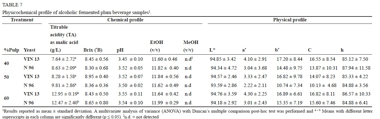 The aim of this study was to measure methanol, ethanol, titratable acidity, objective colour, total soluble solids and sensory profile as a function of yeast and percentage pulp in order to adapt existing technologies toward producing new fermented fruit beverage products using plums, an underutilized agricultural produce.