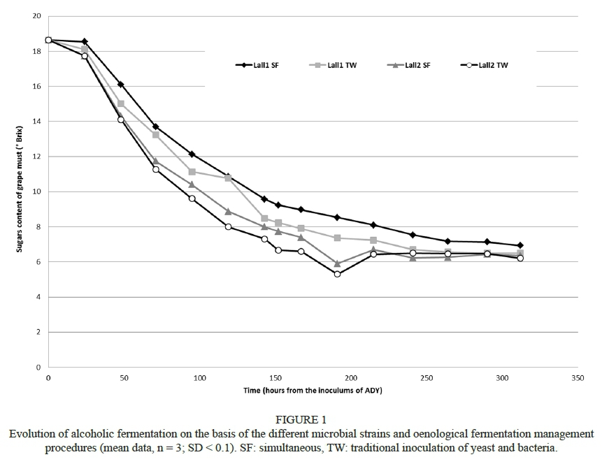 Malolactic fermentation (MLF), the biological conversion of the malic acid of wine into lactic acid, is one of the fundamental bio-transformations occurring during winemaking (Renouf, 2013). This process takes place in almost all red wines and in an increasing proportion of white and sparkling wines, due to the noticeable improvement in their microbiological stability and organoleptic characteristics (Bartowsky et al., 2015). Despite this, malolactic fermentation causes several concerns among winemakers because its evolution cannot be guaranteed (Henick-Kling, 1993; Liu, 2002; Bauer & Dicks, 2004). Wine is not a suitable environment for microbial growth because of the simultaneous presence of certain chemical factors that are able to limit bacterial activity, including ethanol, sulphur dioxide, low pH and the absence of fermentable sugars (Liu & Gallander, 1983; Wibowo et al., 1985; Guzzo et al., 2002; Rosi et al., 2003; Zapparoli et al., 2009). Some authors have highlighted other causes of problems during MLF, including nutritional imbalance and/or toxic compounds made by the yeast responsible for alcoholic fermentation (Comitini & Ciani, 2007). The sum of these factors can cause delays or stuck MLF, with the risk of wine depreciation associated with the occurrence of spoilage phenomena and/or the production of toxic compounds due to indigenous microflora (Lonvaud-Funel, 1999; Spano et al., 2010). The main difficulties in achieving MLF have been observed in the northernmost wine regions due to the pronounced acidity. Wines with a pH of below 3.3 can lead to bacterial stress, making even selected bacterial cultures ineffective if they are not specifically adapted to extremely acidic conditions (Drici Cachon et al., 1996). These experiences suggest that alternative approaches are needed to the management of MLF, including the simultaneous fermentation of yeast and bacteria.
