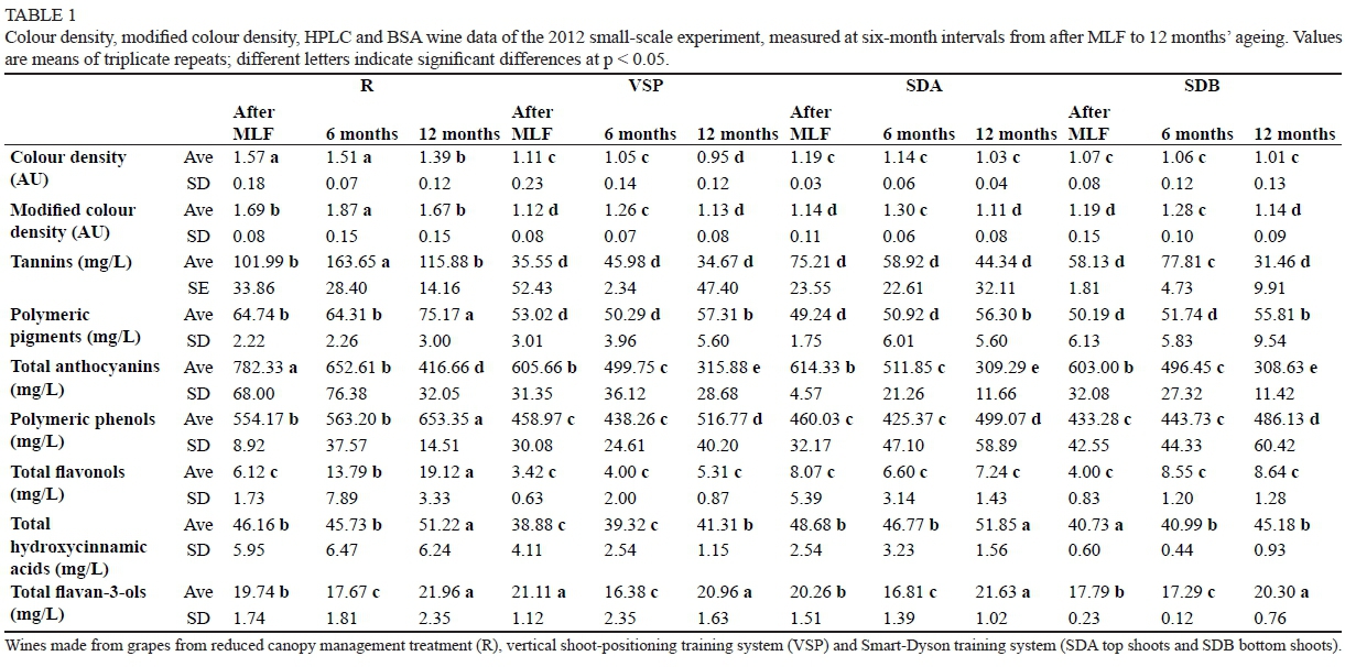 The polymeric phenol results from 2013 show that the R and VSP treatments' wines were significantly higher than the SDA and SDB treatments, with significant increases observed after six months' ageing for all treatments, with the R and VSP treatments remaining significantly higher than the SDA and SDB treatments (Table 2). These results corroborate those found in a previous study (Van Noordwyk, 2012) on the same vineyard in which wines from full and reduced canopy treatments were compared, with the latter treatment also leading to a higher level of polymeric phenols in the wine.