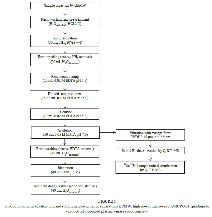 In order to avoid the influence of Rb on the 87Sr/86Sr isotopic ratio, Sr and Rb chromatographic separation was carried out according to the protocol described by Martins et al. (2014). A HIPEX Duran (12 mm internal diameter and 200 mm bed size) column was filled with cationic resin (Dowex 50W-X8/400, Sigma-Aldrich) until around 13 cm. Chromatographic separation included four stages: resin activation/pre-treatment; resin conditioning; sample preparation/dilution; and elution stages. Solutions used were as follows: HCl 32% (v/v) (Merck), EDTA Triplex III p/ analysis (Merck), NH3 25% (v/v) (Merck), and HNO3 bi- distilled 65% (v/v) (Sigma-Aldrich). A summary scheme of the chromatographic separation procedure of Sr and Rb is shown in Fig. 1.