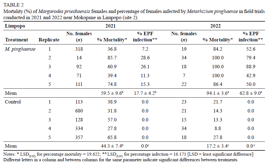 Field trials showed that M. pinghaense was able to successfully infect and kill margarodes females when applied as a soil drench. In 2021, mortality in the control treatments was high, but in 2022, when females were retrieved by hand to eliminate physical injuries sustained during the sieving of soil, mortality was reduced significantly.