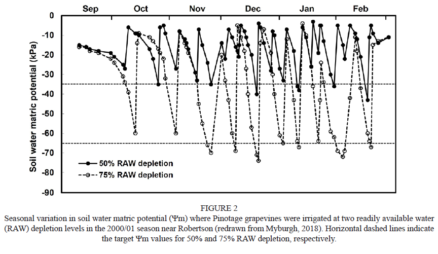 Soil water matric potential was measured weekly, as well as before and after irrigations, using tensiometers at 30 cm, 60 cm and 90 cm depths. A soil water retention curve was determined for each 30 cm depth increment using undisturbed soil cores and the ceramic pressure plate technique (Klute, 1986). The water retention curves were used to determine RAW between -5 kPa and -100 kPa. The soil water retention curves were comparable for the three depth increments and total RAW amounted to 94 mm/m. Based on the soil water retention curves, 50% and 75% RAW depletion amounted to soil matric potentials of ca. -35 kPa and -65 kPa, respectively. Irrigation volumes were measured on S1, S3, S6 and S7 plots by means of water meters. Grapevines were not irrigated during winter months.