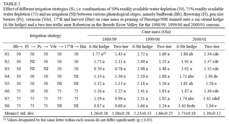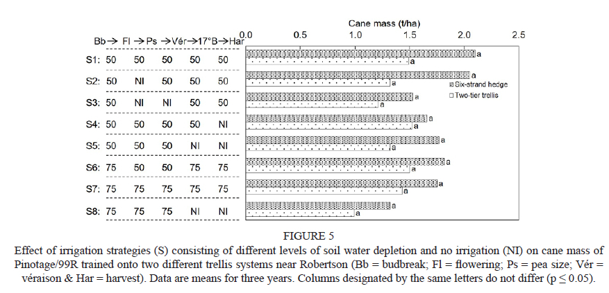 Where irrigation at 50% RAW depletion was terminated at 17°B (S4) or véraison (S5) grapevines tended to have lower cane mass compared to S1, irrespective of trellis system for most of the seasons (Table 1). Where irrigation at 75% RAW depletion was terminated at véraison (S8), cane mass tended to be lower compared to that of grapevines that irrigated at 75% RAW depletion from budbreak until harvest for all of the seasons (S7) (Table 1). Mean cane mass over three years showed similar trends (Fig. 5). This agrees with reduced grapevine cane mass caused by post-véraison deficits compared to a fully irrigated control (McCarthy, 1997). In general, excessive shading due to vigorous vegetative growth can be detrimental to wine colour (Smart, 1982). Visual observations revealed that water deficits tended to terminate shoot elongation. Termination of shoot growth could impact positively on red grape cultivars (Williams et al., 1994).