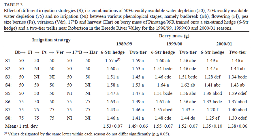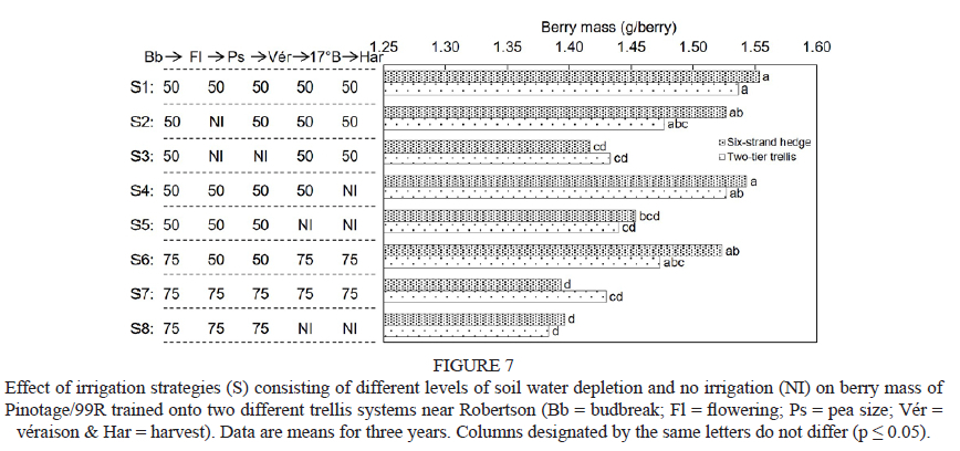Berry mass: In general, trellis system did not seem to have any effect on berry mass in any of the seasons (Table 3). This trend also reflected in the mean values over the three seasons (Fig. 7). Water deficits from flowering to pea size berries (S2) only tended to reduce berry size compared to continued irrigation at 50% RAW depletion (S1), regardless of the trellis system (Table 3). In contrast, water deficits from flowering until véraison (S3) caused a more pronounced reduction in berry size in the 1999/00 and 2000/01 seasons. Similarly, irrigation applied at 75% RAW depletion and stopped at véraison (S8) also reduced berry size compared to S1 in the 1999/00 and 2000/01 seasons. Previous studies also showed that continued water deficits from budbreak until harvest reduced berry size (Santos et al., 2005; Myburgh, 2011; P'erez-Alvarez et al., 2021). On average, water deficits from flowering to véraison (S3) significantly reduced berry mass compared to S1 on both trellis systems (Fig. 7). The reduced berry size caused by pre-véraison water deficits agrees with earlier findings (Hardie & Considine, 1976; Van Zyl, 1984b; McCarthy, 1997). Irrigation applied at 75% RAW depletion until harvest (S7) also reduced berry mass compared to S1 (Fig. 7). Similarly, irrigation applied at 75% PAW depletion from budbreak until harvest reduced berry mass compared to irrigation at 10%, 30% and 50% depletion (Van Zyl, 1984b). Irrigation applied at 50% RAW depletion and stopped at véraison (S5), as well as 75% depletion stopped at véraison (S8) also reduced berry mass (Fig. 7). Post-véraison water deficits caused a similar reduction in berry size of Cabernet Franc (Hardie & Considine, 1976).