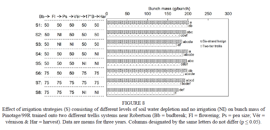Bunch mass: The trellis system had no effect on bunch mass in the 1998/99 and 1999/00 seasons (Table 4). In the 2000/01 season, bunches were smaller on the two-tier trellis than on the six-strand hedge for some irrigation strategies. Considering the mean bunch mass over the three seasons, the trellis system did not have any effect on bunch mass (Fig. 8). Although there were differences in bunch mass between the irrigation strategies in the 1998/99 and 2000/01 seasons, there were no consistent trends (Table 4). On average, grapevines on the six-strand trellis only produced smaller bunches where irrigation at 75% depletion was stopped at véraison (S8) compared to S1 (Fig. 8). In the case of the two-tier trellis, pre-véraison deficits (S2 & S3) as well as deficits during berry ripening (S5) reduced bunch mass compared to S1. The sensitivity of bunch mass to pre-véraison water constraints was also found in a previous study (McCarthy, 1997). The driest irrigation strategy, i.e. where irrigation at 75% depletion was stopped at véraison (S8), also produced smaller bunches on the two-tier trellis compared to S1 (Fig. 8). This trend agrees with previous findings (Hardie & Considine; McCarthy, 1997; Santos et al., 2005). Surprisingly, irrigation at 75% RAW depletion from budbreak until harvest (S7) only tended to produce smaller bunches compared to S1 (Fig. 8). In contrast, grapevines that were subjected to water deficits from budbreak until harvest produced smaller bunches compared to more frequent irrigation (Santos et al., 2005; Lategan, 2011; Myburgh, 2011; Lategan & Howell, 2016).