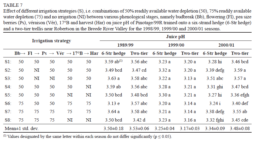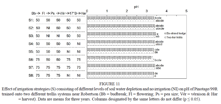 pH: In the 1998/99 season, trellis system had no effect on juice pH, except for the low pH in grapes produced on the six-strand hedge where 75% RAW depletion was changed to 50% depletion between flowering and pea size berries (S6) (Table 7). In the 1999/00 season, the trellis system had no effect on juice pH. In the 2000/01 season, the pH in juice produced on the two-tier trellis was higher compared to the six-strand hedge, except where irrigation at 50% RAW depletion was stopped from flowering to véraison (S3) and during berry ripening (S5). On average, irrigation strategy had no effect on juice pH, except that grapes produced on the six-strand hedge where irrigation at 50% RAW depletion was stopped from flowering to véraison (S3) had higher pH compared to some of the other strategies (Fig. 11). In contrast, juice pH was the lowest where 75% RAW depletion was changed to 50% depletion between flowering and véraison (S6). The foregoing agrees with previous studies which showed that irrigation strategies do not have major effects on juice pH (Hardie & Considine, 1976; Van Zyl, 1984b; Medrano et al., 2003; Santos et al., 2005; Myburgh, 2006; Acevedo-Opazo et al., 2010; Myburgh, 2011; Williams & Heymann, 2017; P'erez-Alvarez et al., 2021). It is also noteworthy that the juice pH for all the trellis system/irrigation strategy combinations was in the optimum range of 3.0 to 3.5 for winemaking (Kodur, 2011; Walker & Blackmore, 2012).