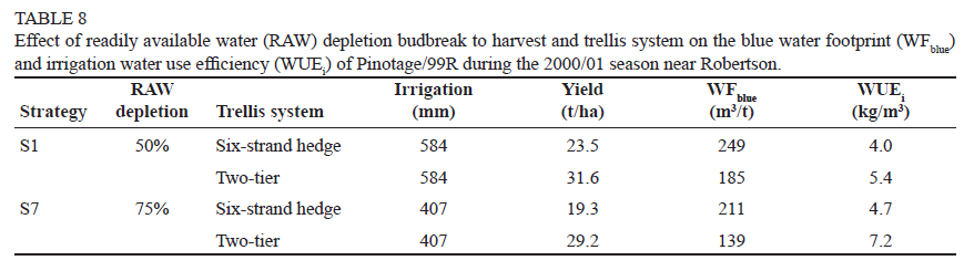 Surprisingly, the WUE of the micro sprinkler irrigated grapevines on the six-strand hedge (Table 8) was comparable to 5.01 kg/m3 (Mirás-Avalos et al., 2016), and even higher than 2.69 kg/m3 (P'erez-Alvarez et al., 2021) reported for drip irrigated grapevines on vertical trellises. In contrast, the WUEi was appreciably lower than 10.4 kg/m3 obtained with drip irrigated Merlot on a vertical trellis (Myburgh, 2011). In the case of the two-tier trellis, the WUEi of grapevines was only slightly less than the 7.9 kg/m3 of drip irrigated Thompson seedless grapevines on a horizontally orientated trellis system in the Breede River Valley (Myburgh & Howell, 2023). The WUE of grapes produced on the two-tier trellis where irrigation was applied at 75% RAW depletion was 78% higher compared to the six-strand hedge with irrigation applied at 50% RAW depletion (Table 8). Results confirmed that it is possible to increase the WUE, or reduce the WFblue, substantially by producing more grapes with less irrigation water.