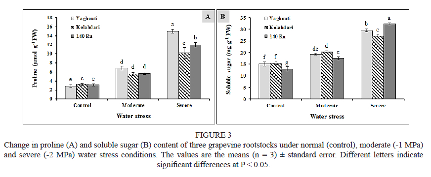The objective of this study was to evaluate the biochemical and physiological characteristics of two traditional grapevines ('Yaghouti' and 'Kolahdari') used as rootstocks for Sultana in response to water stress in comparison with the hybrid rootstock of 140 Ru.