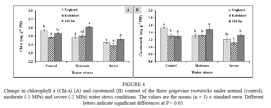 The highest concentration of chlorophylls and carotenoids was observed in 140 Ru under a water potential of -1 MPa, thereby increasing photosynthetic efficiency. These results are consistent with previous findings that grafting onto a tolerant rootstock improved the photosynthetic efficiency of plants under drought stress (Penella et al., 2014). Chlorophyll (a and b) and carotenoids decreased significantly in Sultana grafted on Kolahdari and Yaghouti rootstocks under water stress. This decrease in photosynthetic pigments under stress is a common phenomenon also found in some other grapevine rootstocks (Madadi et al., 2021), mung bean (Sadiq et al., 2017), carrot (Razzaq et al., 2017), canola (Akram et al., 2018) and apple rootstock (Alizadeh et al., 2011). This phenomenon may be due to the instability of protein complexes and the destruction of chlorophyll caused by the enhanced activity of chlorophyllase enzyme (Kabiri et al., 2014; Kapoor et al., 2020). Carotenoids boost the plant's reaction to oxidative stress. The percentage content of carotenoids increases with a decline in chlorophyll (Bhandari et al., 2016). The results show that rootstock 140 Ru was the most drought tolerant due to several factors, including the highest accumulation of carotenoid content.