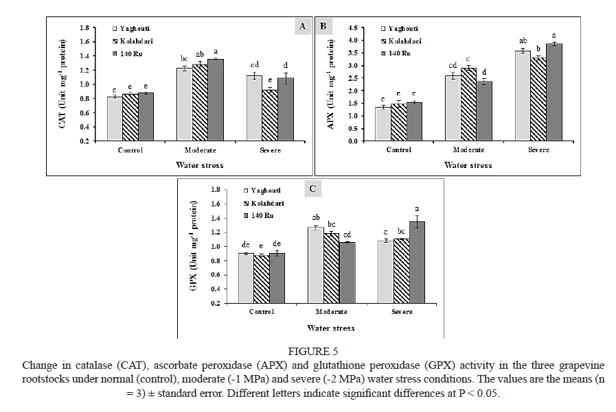 On the other hand, grapevine rootstocks differed in their activity of GPX enzyme under water stress. The water potential of -2 MPa increased the GPX activity in 140 Ru rootstock, while it reduced the GPX activity of Yaghouti rootstock (Fig. 5C).