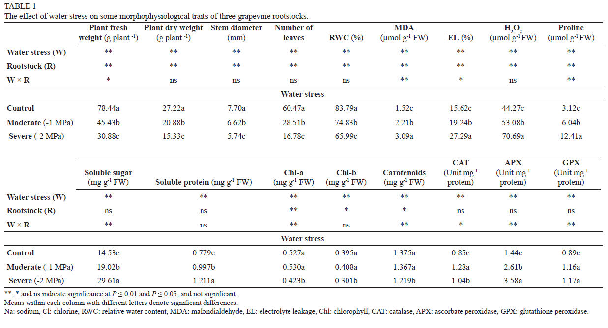In addition, the number of leaves and stem diameter were significantly affected by water stress and rootstock (Table 1). Sultana scions grafted on Yaghouti and 140 Ru rootstocks had the most leaves per plant, while 140 Ru rootstocks had the largest stem diameters (Table 2). Nevertheless, the diameter of the stem was not significantly different between Sultana scions grafted on Yaghouti and Kolahdari rootstocks. Moreover, water stress negatively affected these parameters, so the highest and lowest numbers of leaves and stem diameter were achieved in the control and -2 MPa, respectively (Table 1).