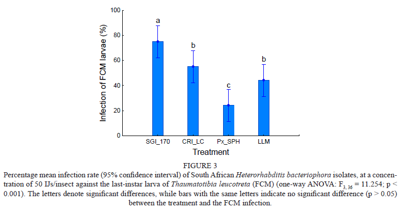 As with the study conducted by Steyn et al. (2017), 50 IJs/50 μ! were inoculated per well. Geisert et al. (2023) obtained a high mortality against corn rootworm larvae when inoculated with 60 IJs and 120 IJs per well, with between 80% and 100% mortality being obtained. Wells inoculated with 30 or fewer IJs had a mortality of < 50% (Geisert et al., 2023). From this, the inference can be made that inoculating a high number of IJs per well per larva would likely result in an increased mortality rate. The reason for isolates having reduced mortality could be that the FCM were less susceptible to infectivity compared to the other isolates concerned. The isolate with the second highest mortality was CRI_LC, at 50%.
