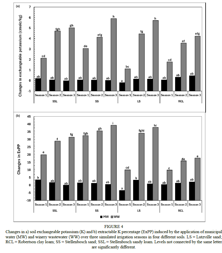 Changes in exchangeable K induced by the application of WW were larger in LS, SS and SSL and lower in RCL. Similar trends were observed for ExPP (Fig. 4b). The changes in both exchangeable K and ExPP seem to be influenced by CEC, and consequently K-buffering capacity. In this instance, RCL has high K-buffering capacity followed by SSL. High K-buffering capacity is important in regulating exchangeable K (Elephant et al., 2019) and might mitigate the negative effects of high K inputs from undiluted WW, which are associated with increased K uptake. This reduces grape juice quality and leads to deterioration of the soil structure (Kodur, 2011; Rengasamy & Marchuk, 2011; Hirzel et al, 2017). Soils thus are crucial when devising a strategy for handling undiluted WW. However, in the current study, ExPP increased and exceeded the threshold of 15, at which the deterioration of the soil structure begins (Levy & Torrento, 1995; Mulidzi et al, 2019).
