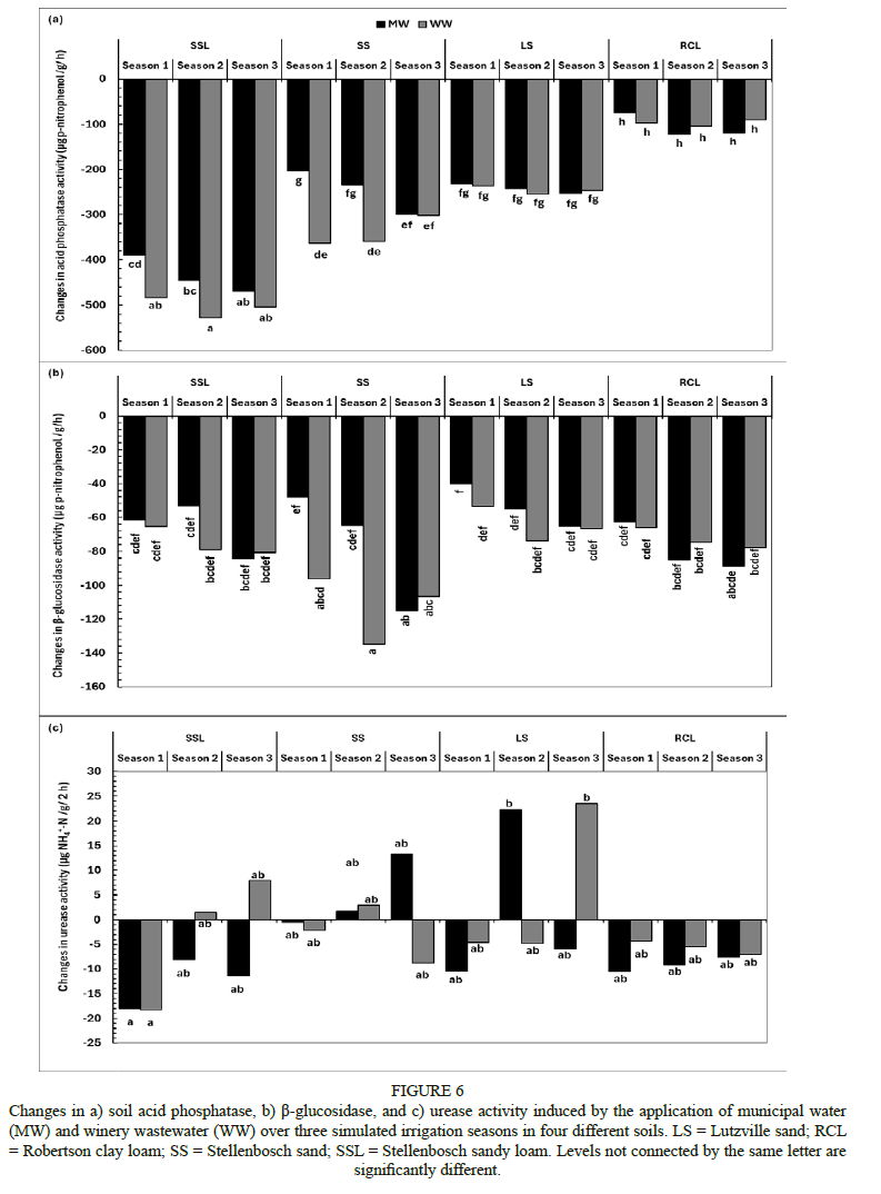The in-field fractional use (augmentation) of undiluted alkaline winery wastewater (WW) with raw water for the irrigation of grapevines can reduce the abstraction of water from natural resources and mitigate global water shortages. However, undiluted WW could pose a threat to soil function and enzyme activities, which are early soil quality indicators. Hence, this study used a pot experiment to compare changes in physicochemical properties and enzyme activities of four different soils irrigated with undiluted WW and municipal water (MW) over three simulated irrigation seasons. The soils were collected from the top 0 cm to 30 cm soil layer to which no WW had previously been applied - in the Stellenbosch (sandy loam and sand), Robertson (clay loam) and Lutzville (sand) regions. The water sources were MW, which served as the control, and undiluted WW, and they were both analysed before each irrigation event. Irrigation with undiluted WW resulted in larger increases in soil pH, electrical conductivity (EC) and exchangeable K and Na for all soils and simulated irrigation seasons. The activities of acid phosphatase, β-glucosidase and urease were negatively affected by the addition of undiluted WW. Changes in acid phosphatase activity were negatively correlated with changes in soil pH and EC, while changes in β-glucosidase activity were negatively correlated with changes in soil pH, EC and exchangeable K, Na and Mg. The pH had a dominant effect because of its influence on enzyme activities, precipitation reactions and the development of saline-sodic soils. Root exudates, acidification from nitrogen fertiliser and the uptake of K by crops can mitigate the potential risk of using undiluted alkaline wastewater.