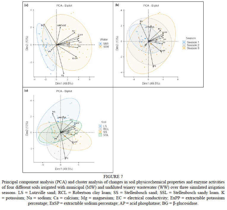 Enzymes are rapid indicators of the changes in soil quality that could be brought about by undiluted WW (Adetunji et al., 2017). They are also preferred, because they are related to important soil quality parameters such as soil organic matter, soil physicochemical properties, microbial activity and biomass (Alkorta et al., 2003). In this way they are an integrated soil quality indicator and reflect the impact of amendments and management practices on soil biology (Ghosh et al., 2020). Despite the conflicting literature on the effects of environmental factors on enzyme activities, they play a crucial role in nutrient cycling, particularly β-glucosidase, phosphatase and urease, which are involved in carbon, phosphorus and nitrogen cycling, respectively (Xing et al., 2020). A decrease in the activity of these enzymes indicates low cycling of these nutrients from soil organic matter (Alkorta et al., 2003). A previous study reported an increase in β-glucosidase, phosphatase and urease activities following the application of diluted WW (Mulidzi & Wooldridge, 2016). However, the interaction between soil chemical properties and enzyme activities, which would give a broad understanding of the effects of WW, was not considered. This limits the prediction of what would happen with the in-field augmentation of undiluted alkaline WW or, any wastewater with varying water quality. Hence, the aim of this study was to evaluate the effects of undiluted alkaline WW on selected chemical properties and enzyme activities. The effect of irrigation with undiluted WW and municipal water (MW) on the changes in soil pH, EC, exchangeable cations and enzyme activities of four different soils were compared in a pot experiment over three simulated irrigation seasons. In addition, the relationship between changes in soil chemical properties and enzyme activities were explored.