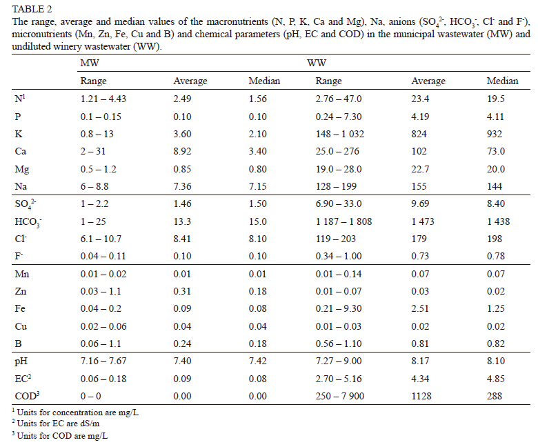 The two water sources used for this experiment were MW, which served as the control, and undiluted WW. The MW used for the control treatments was obtained from the tap at the lysimeter facility at ARC Infruitec-Nietvoorbij. The undiluted WW was collected from a winery near Stellenbosch and was stored in a 2 500 L plastic tank adjacent to the lysimeter facility. Samples of both water sources were collected for each irrigation event and analysed for N, P, K, Ca, Mg, Na, SO42-, HCO3-, Cl-, F-, Mn, Zn, Fe, Cu, B, pH, EC and COD by a commercial laboratory. The composition of each water source varied widely (Table 2), and the pH of undiluted WW was consistently alkaline. Although both water sources differed in their composition, they both had low concentrations of heavy metals, indicating low pollution risk.
