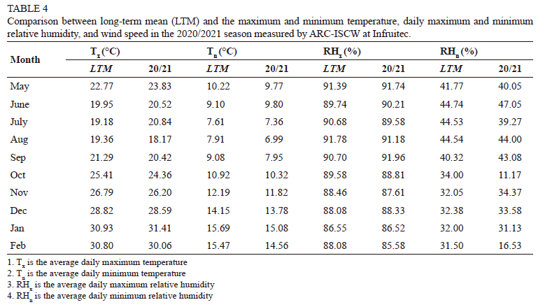 The data includes maximum and minimum temperatures and daily maximum and minimum relative humidity for each month from May 2020 to February 2021 (Table 4). Generally, the 2020/2021 season showed slight variations from the long-term mean (LTM) across most parameters. Maximum temperatures in the 2020/2021 season were marginally higher in some months (May, June and July), and lower in others (such as August and September) than the LTM. Minimum temperatures followed a similar pattern, with some months showing slightly lower values in 2020/2021 compared to the LTM. Maximum relative humidity from May 2020 to February 2021 were similar to the LTM values, with only minor fluctuations. Notably, there were significant drops in minimum relative humidity for October and February in the 2020/21 season compared to LTM.