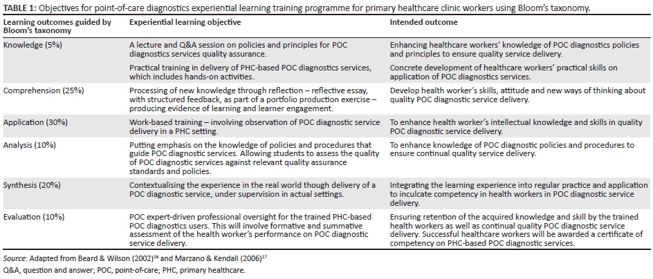 Delivery of high quality POC diagnostic services requires highly competent and dedicated staff. A special focus on well-structured POC diagnostic training strategies for improving staff competency in performance and quality maintenance for POC diagnostic services is urgently needed to ensure the highest quality diagnostic services. We recommend a guided framework, based on a Bloom's taxonomy approach, for implementing a POC diagnostics experiential learning programme to improve POC testing proficiency and staff retention in PHC workers. Stakeholder engagement, consensus building and collaboration will be crucial to ensuring appropriate implementation and sustainability of the proposed programme.