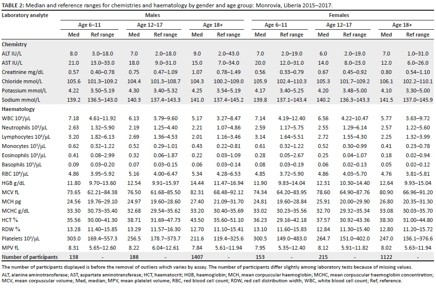 METHODS: Serum chemistry and haematology values from 2529 adults and 694 children and adolescents obtained from two studies conducted in Liberia between 2015 to 2017 were used to determine reference limits. After removing outliers, the reference limits defined by the 2.5th and 97.5th percentiles were determined by sex in three age groups (6-11, 12-17, and 18+ years.