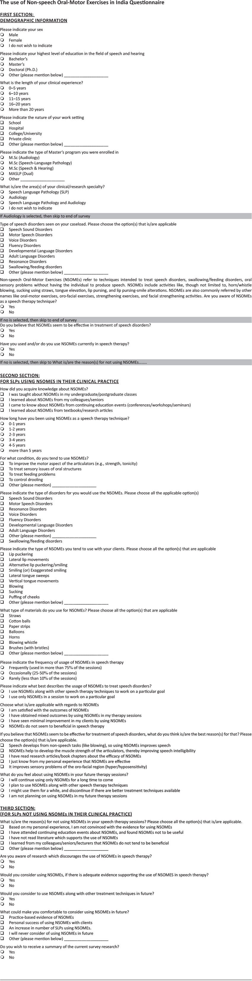 A questionnaire was created using the Qualtrics© software (Qualtrics, Provo, UT, 2005) for the purpose of online data collection. The questions listed on the survey were prepared specifically to suit the nature of academic training related to communication disorders in India, and the work environment of Indian SLPs. The questionnaire comprised three sections of 27 questions in total, and took approximately 10 min to complete. The questionnaire included multiple-choice and yes/no questions. A majority of the questions allowed the respondents to choose multiple answers from the provided options. However, a small number of questions required the participants to choose just one option. The first section of questions solicited demographic details of the participants such as the type of work setting, work experience, education, gender, and area of clinical specialty. The second section consisted of questions related to the use of NSOMEs by the participants including, though not limited to clientele information, speech disorders for which NSOMEs were used, type of NSOMEs used, and frequency of use of NSOMEs. If the participants indicated that they did not use NSOMEs, they were directed to the third section of questions. The third section elicited information from respondents who did not use NSOMEs in their clinical practice (please see Appendix for the complete questionnaire).