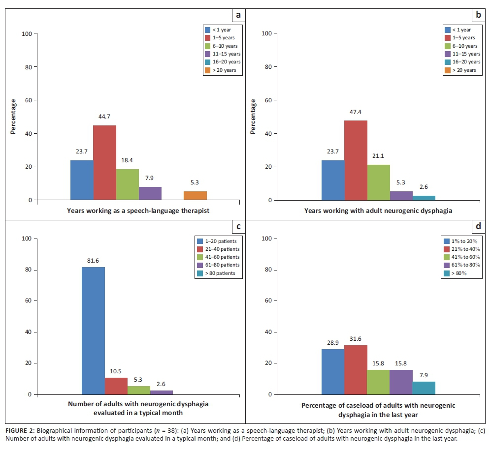 Participants were selected via purposive sampling. Only people with specific knowledge and skills were invited to take part, with the purpose of being able to provide data competently for the study (Leedy & Ormrod, 2013). Training with regularly working with adults with neurogenic dysphagia enables one to be proficient in assessing this population and thus to provide valid data for the study (HPCSA, 2009). Participants were practitioners who had a speech-language therapy degree in 2014 or earlier. The participants were currently working with adults with neurogenic dysphagia post-acute stroke in South Africa. These participants, therefore, had sufficient and recent experience and knowledge with this population (HPCSA, 2009). A total of 38 participants completed the electronic questionnaire. Babbie and Mouton (2001) state that 5-25 participants in the interpretive paradigm is a sufficient sample size. Most of the participants in the study (n = 17; 44.7%) had between 1 and 5 years of experience both as a speech-language therapist and working with adults with neurogenic dysphagia, and 23.6% (n = 9) of the participants were completing their community service year (first year of work) (Figure 2).