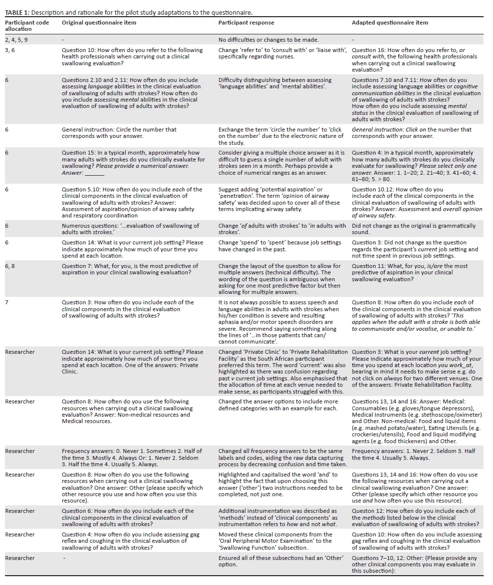 The researcher performed a narrative review of the literature to inform the adaptation of a questionnaire from a study by Bateman et al. (2007). A narrative review is a thorough review of published literature on a specific topic. It has been known to consist of relatively unsystematic methods, but is a good summary of up-to-date information (Green, Johnson & Adams, 2006). The study was replicated and based on a questionnaire taken and adapted from a study by Bateman et al. (2007), and thus all its clinical components were replicated and included in the current study. Further modifications from a pilot study were applied to the questionnaire to improve its content and layout and overall feasibility (Table 1). Eight participants returned a feedback sheet electronically reporting questionnaire adaptations. Participants had 2 weeks over August and September 2015 to participate in the pilot study. The South African Speech-Language-Hearing Association (SASLHA) recruited participants by e-mail and via the social media website Facebook®. Participants accessed the self-administered, electronic questionnaire on the web survey development company website Survey Monkey® over a time frame of 4 weeks in October and November 2015.
