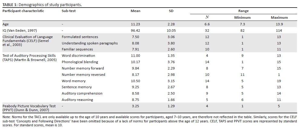 Individuals were excluded if they demonstrated below average intelligence based on the Senior South African Individual Scale - Revised (SSAIS-R) (Van Eeden, 1997) and also if they spoke English as a second language. Children receiving additional chronic medications were not permitted to take part in the study, as this may have clouded the results obtained.