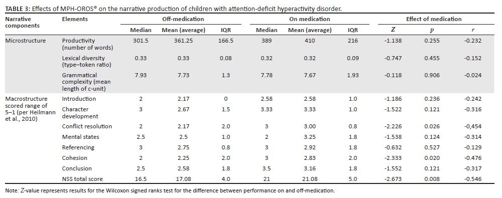 Therefore, because of the large role that narratives play in academic and social settings, it is evident that narrative inability in children with ADHD cannot be ignored by those professionals working with this population. The findings that MPH-OROS® improves aspects of narrative ability in children with ADHD could be valuable information for clinicians and speech-language pathologists as this, if replicated, might prove beneficial when guiding parents in decision-making processes regarding medication as well as the ongoing necessity of speech-language therapy in children with ADHD