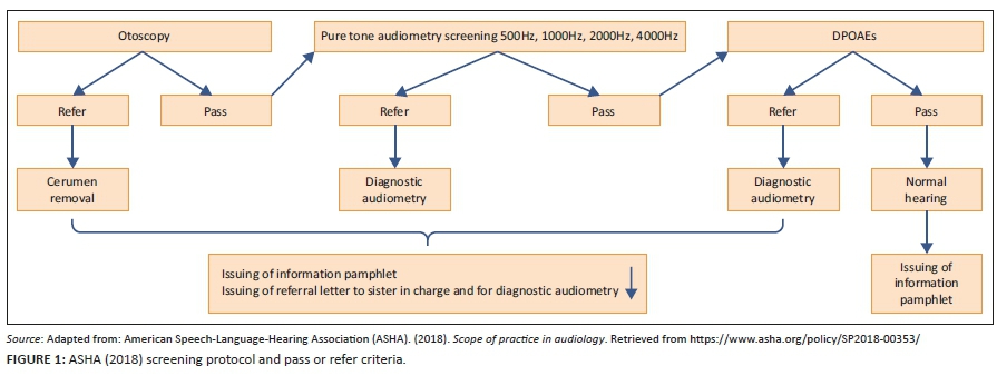 Hearing screening was conducted on all participants (n = 60) without hearing aids. Otoscopy, pure tone audiometry (Pta), tympanometry and otoacoustic missions (OAEs) screening were conducted. Pure tone audiometry was conducted over the range of 500 Hz-4 kHz according to the protocol. The intensity level was set at 25 dBHL (ASHA, 2018). Otoacoustic emissions were included because of their sensitivity in detecting cochlear dysfunction, which is associated with ageing. The screening protocol, pass or refer criteria (ASHA, 2018), as well as the referral pathway, are illustrated in Figure 1. All participants received an informational pamphlet regarding ear care at the end of the screening process. Participants who obtained a 'refer result' (failed two or more frequencies) were appropriately referred to the relevant professionals such as general practitioners for cerumen management and audiologists for diagnostic testing.