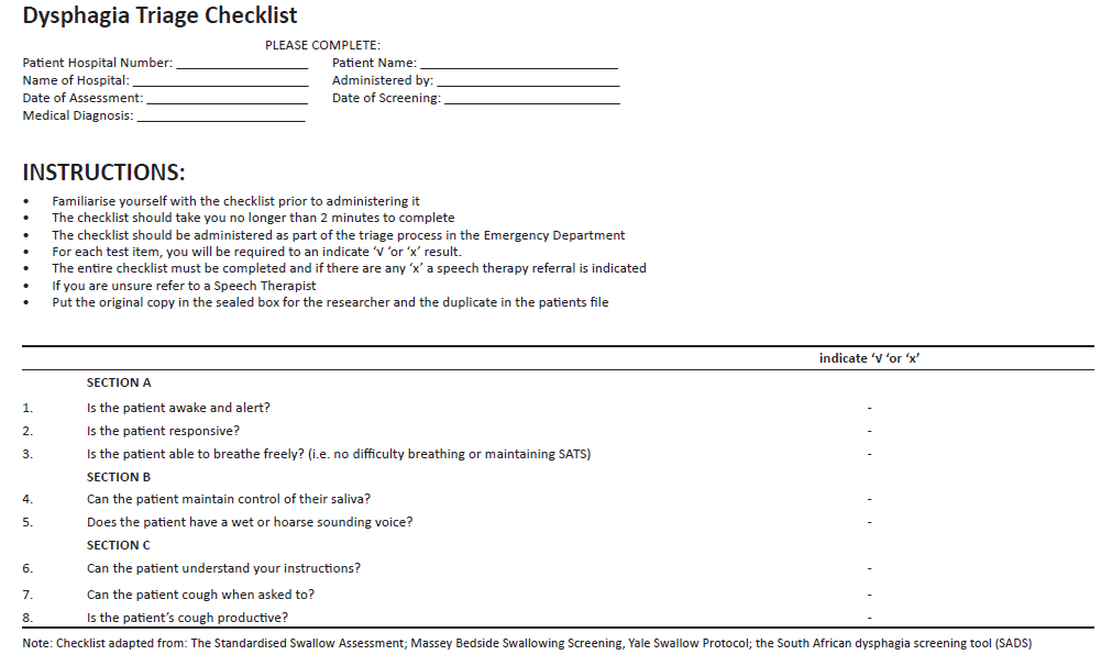 All patients who were treated at the MEU at the time of data collection were triaged for dysphagia as well. To establish the sensitivity and specificity of the triage checklist, it was necessary for all patients who underwent the dysphagia triage to be screened for dysphagia, regardless of pass or fail. The researchers completed the dysphagia screening but were blinded to the results of the triage until after the screening was completed. The South African Dysphagia Screening Tool (SADS) (Ostrofsky & Seedat, 2016) was used.
