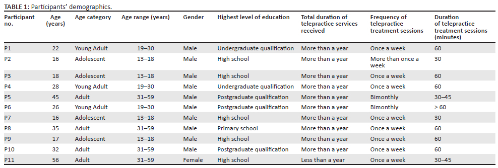 A purposive sampling method was used to select PWS who have received tele-intervention services. Permission was obtained to recruit members from the Clinic of Fluency Disorders from the Department of Speech-Language Pathology and Audiology at the University of Pretoria. An information letter was provided to prospective participants and informed consent was obtained. A total of 11 participants were included based on recruitment capacity and specific inclusion criteria.