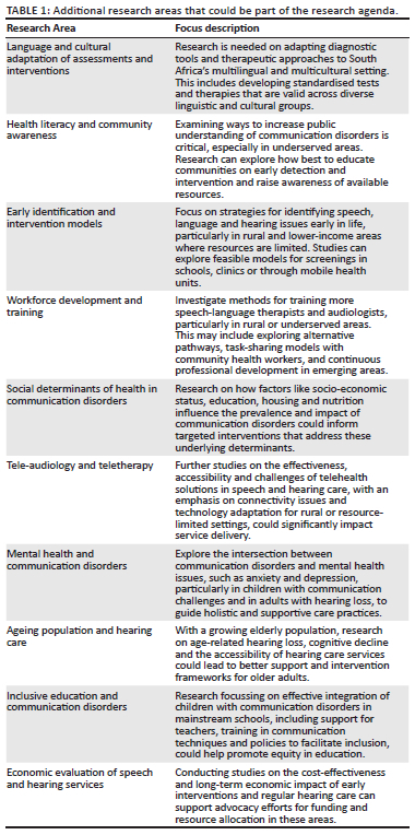 In compiling the above-stated research areas, priority was given to topics frequently emphasised in peer-reviewed studies, as well as areas that have shown significant potential for impact based on local clinical experiences and community feedback. The inclusion of these areas is not exhaustive but highlights the most urgent research priorities for advancing speech and hearing care in South Africa.