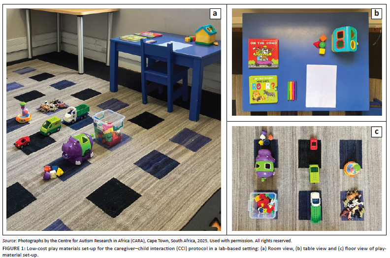 After consenting to participate, the dyads were video-recorded during their baseline assessment, using a standardised CCI protocol. The CCI consisted of two consecutive 6-min free play sessions referred to as 'Part one' and 'Part two'. In Part one, the caregiver was instructed to remain seated, while their child interacted with play materials in the room. In Part two, the caregiver was instructed to interact with their child in a way they would at home. After the caregiver-child dyads had completed 12 coaching sessions, the dyads attended a follow-up assessment. During the follow-up assessment, the standardised CCI protocol was repeated. The video recordings of the CCI were uploaded to Duke Box (a Health Insurance Portability and Accountability Act-compliant transfer and storage platform hosted by Duke University). All CCI occurred in the same room (see Figure 1 for material set-up for the CCI protocol).
