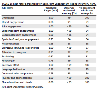 Inter-rater reliability for each JERI item is outlined in Table 2. Weighted Kappa values for 13 of the 16 JERI items ranged from 0.62 to 1, indicating moderate to strong agreement between raters. The observer estimated accuracy of weighted Kappa values, ranged between 83% and 99%. Joint Engagement Rating Inventory items with moderate to strong agreement included unengaged, object engagement, joint engagement, symbol-infused joint engagement, responsiveness, expressive language level and use, attention to caregiver, following in on child's focus, affect, communicative temptations and fluency and connectedness. Percentage agreements within one scale point ranged between 75% and 100% across JERI items.