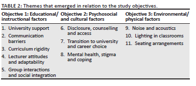 For Objective 1, which focused on educational or instructional factors, five themes emerged. Objective 2 related to psychosocial and cultural factors, yielded three themes. Lastly, Objective 3, concerning environmental factors, resulted in three themes. These themes are summarised in Table 2.