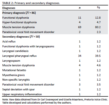Out of the total number of patients who attended the voice clinic (n = 516) between January 2017 and July 2022, 86 (16.67%) patients were diagnosed with an FVD. The data from the 86 patients with FVDs were analysed for this study. From the sample, 24.4% (n = 21) were male patients and 75.6% (n = 65) were female patients. Their ages ranged from 18 years to 77 years old (mean = 47.26; standard deviation [s.d.] = 13.643). Many patients who presented with a primary diagnosis of an FVD (100%) presented with a secondary ENT-related diagnosis (58.1%; n = 50). The most prevalent primary diagnoses of FVDs were MTD (80.2%; n = 69) followed by functional dysphonia (12.8%; n =11).