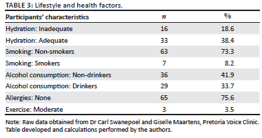 Lifestyle and health factors that were explored included hydration, smoking, alcohol consumption, allergies and exercise. The results are reflected in Table 3. While 18.6% (n = 16) of the participants had inadequate hydration (i.e. consumed less than two litres of water a day), 3.5% (n = 3) exercised moderately. Most of the participants (73.3%, n = 63) were non-smokers and 8.2% (n = 7) were smokers, while 41.9% (n = 36) did not consume alcohol. The majority of the participants (75.6%; n = 65) did not have any allergies.