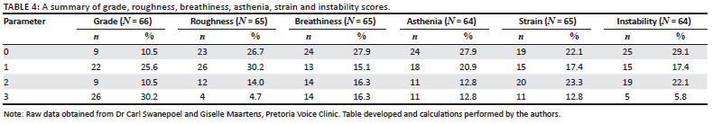 The perceptual assessment of voice quality of 65 participants (75.58%) was analysed using the Grade, Roughness, Breathiness, Asthenia, Strain (GRBASI) scale.