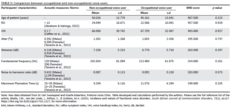The two groups namely, OVUs versus non-OVUs, categorised according to the use of their voice as indispensable for their work or not, were compared (Phyland & Miles, 2019). There were 31 patients out of the sample population who were OVUs (43.66%; mean = 3.32) and 40 non-OVUs (56.35%; mean = 2.73). According to the results of the Mann-Whitney test, no significant difference between the two groups was observed (p-value = 0.247, z score = 1.156, MW score = 522.000).