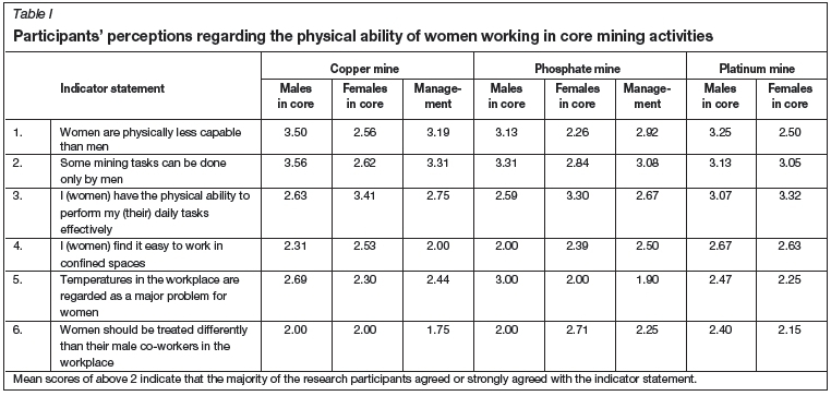 Statements were included to determine the perceptions of the three target groups, namely men and women employed in core mining positions and management, of the physical ability and capability of women employed in core mining positions. The descriptive statistics are presented in Table I for the three target groups at each of the three mines. To avoid duplication, the results are explained according to factor analysis. Factor analysis can be defined as a technique for identifying groups or clusters of variables (statements) (Field, 2005, p. 619).