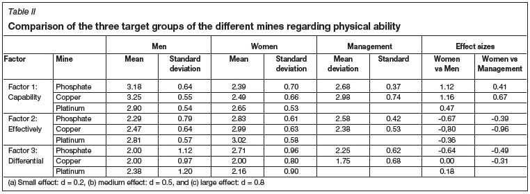 From Table II, it follows that the effect sizes for the Capability factor show a medium and large effect, indicating that, on average, the participants from the male and management target groups are more in agreement with the indicator statements contained in the Capability factor than the female target group themselves. The effect sizes for the Effectively factor indicate that the participants from the female target groups of the phosphate and copper mines are more in agreement with the indicator statements contained in the factor than the participants from the male and management target groups at these mines. A medium effect is evident from the effect sizes of the phosphate mine for the Differential factor, indicating that, on average, the female participants from the phosphate mine feel that they should be treated differently from their male co-workers in the workplace, while this view is not supported by the research participants in the male and management target groups.