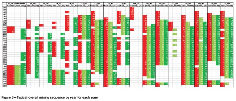 Figure 3 illustrates how the model was set up to enable the optimizer to schedule waste development, ore development, and ore extraction from production stopes in each zone, with built-in lags from initial waste development to the other phases of mining. This summary table was produced for each optimization run. It facilitated a very rapid visual check in each case to ensure that zone sequence rules in respect of the physical location of zones in relation to the shafts and the ability of the mining teams to access specific zones were being followed. The number of zones being mined in any year and the progression from waste development into ore mining could also be followed, enabling the amount of mining equipment and labour as well as the ventilation requirements to be inferred. Mechanisms of this type are important in any strategic optimization exercise to ensure that the solution being offered is likely to be practicable as the design and development of a project progresses.
