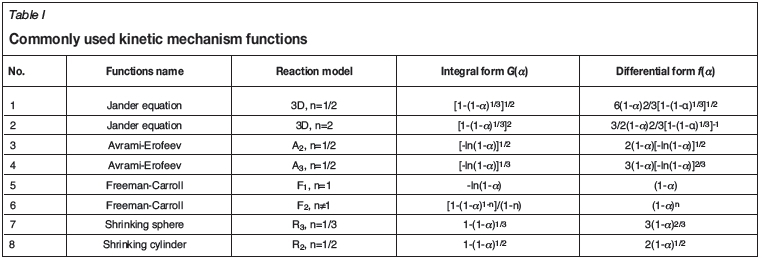 The commonly used kinetic mechanism functions G(a) are inserted into Equation [4] to fit the experimental data one-by-one. The correlation coefficients can be obtained from the plots of ln[G(a)/72] against 1/T, which are used to choose the mechanism function G(a). Eventually, the apparent activation energy (Ea) and former factor (A) can be calculated. Some commonly used functions (Hu et al., 2008) are shown in Table I.